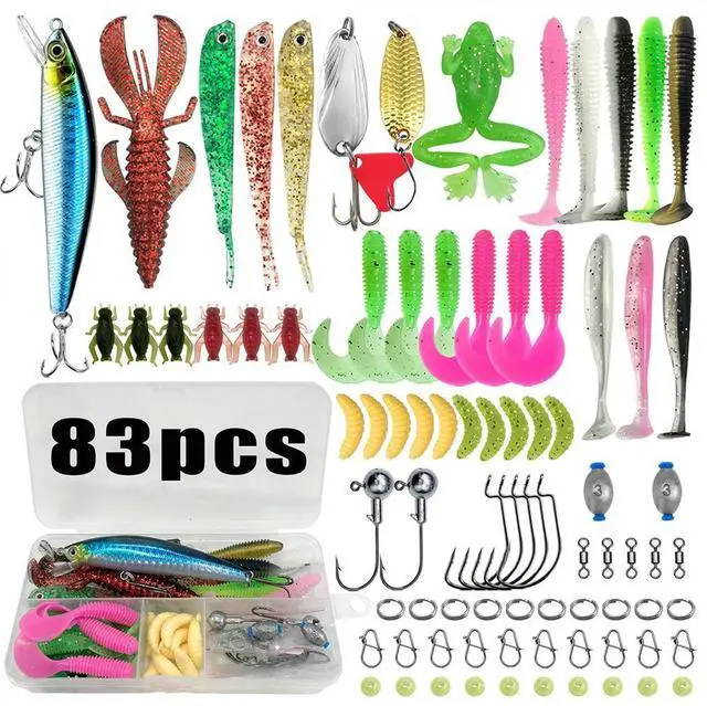 83pcs Fishing Lures Kit Soft and Hard Bait Hooks Sinker Weights Swivels Fishing Gifts for Men