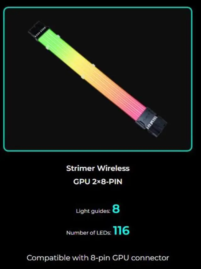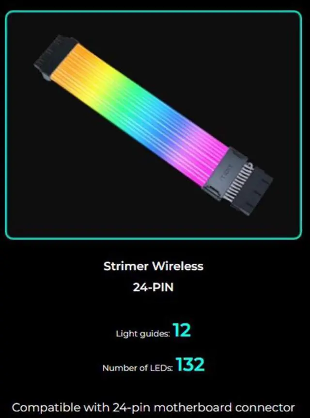 The STRIMER Wireless 24-Pin has a total of 132 LEDs and the STRIMER Wireless GPU 2x8-PIN has 116 LEDs. Strimer Wireless seamlessly combines cutting-edge technology with elegant design. Its the perfect blend of innovation and aesthetic appeal, transforming the user experience.