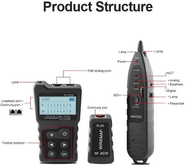 Testing Function: including cable continuity testing, cable length measurement, cable scan, and PoE test.