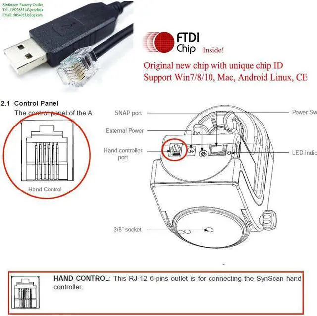 4m USB remote control PC cable for Sky-Watcher SynScan telescopes FTDI White