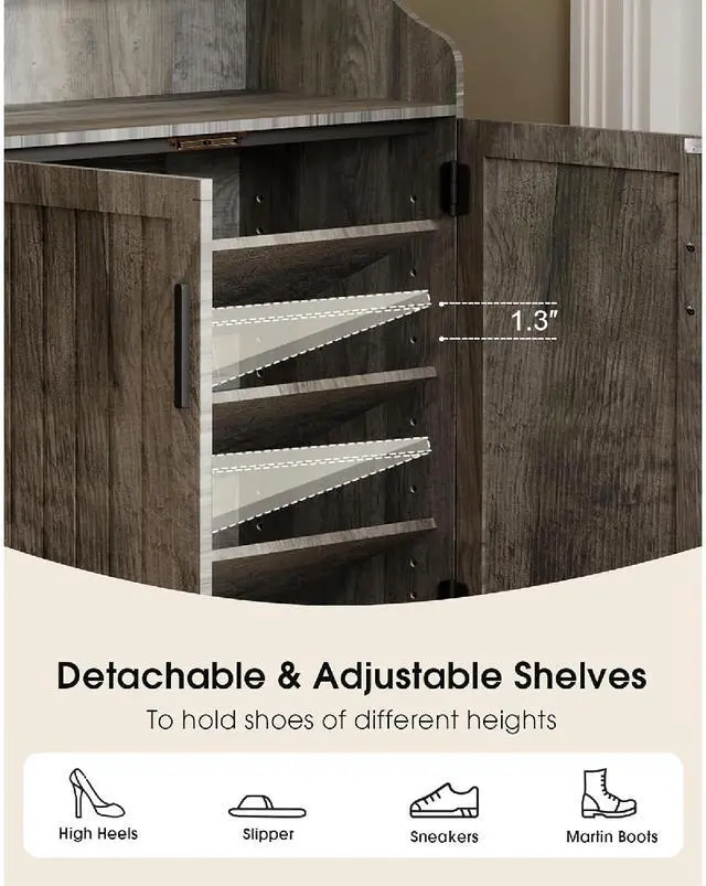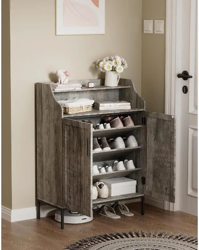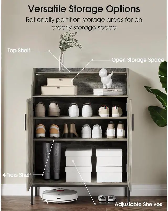 This modern 4-tier shoe cabinet provides a spacious and customizable storage solution for your entryway, hallway, or any room. Featuring both open and closed compartments, it can efficiently organize 1520 pairs of shoes, including larger sizes like boots and high heels. The interior boasts adjustable shelves with 16 placement options, allowing you to tailor the storage to fit various footwear types or other household items. Its raised base simplifies cleaning underneath and offers added comfort when changing shoes. Beyond footwear, this versatile cabinet doubles as an organizer for bags and accessories.