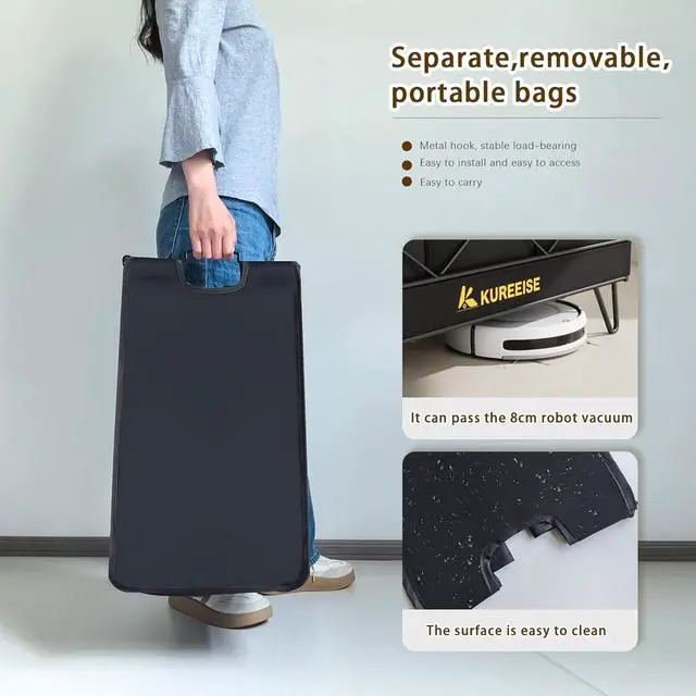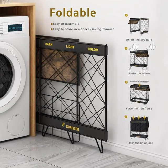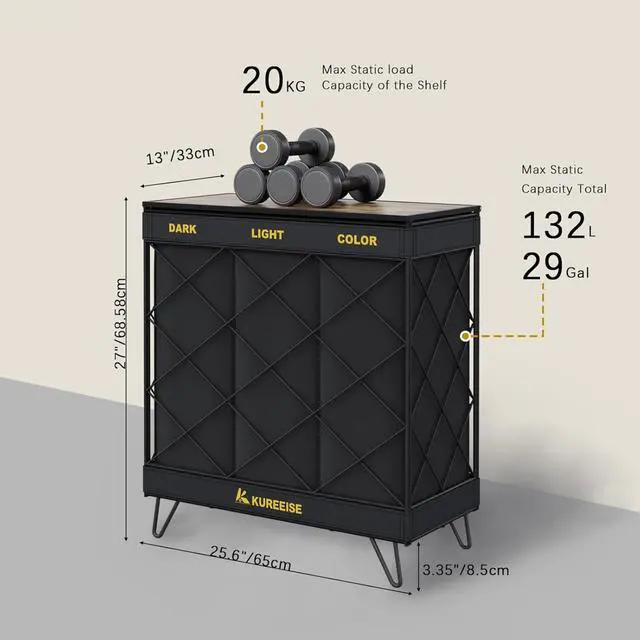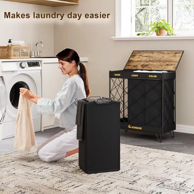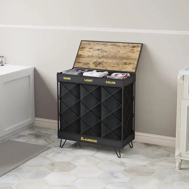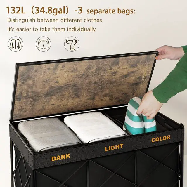 Spacious 3-section laundry hamper with lid, removable bags, and foldable iron frame for easy sorting, storage, and cleaner laundry organization in any room. Type: 3-section laundry hamper; Capacity: 132L (34.8 gal); Compartments: Dark, Light, Color; Bags: Removable with handles; Material: Iron frame, fabric bags, wood lid; Size: 65×33×68.6 cm (25.6"×13"×27"); Top Load Capacity: 20 kg; Leg Height: 8.5 cm; Use: Laundry room, bedroom, bathroom, closet.