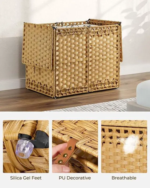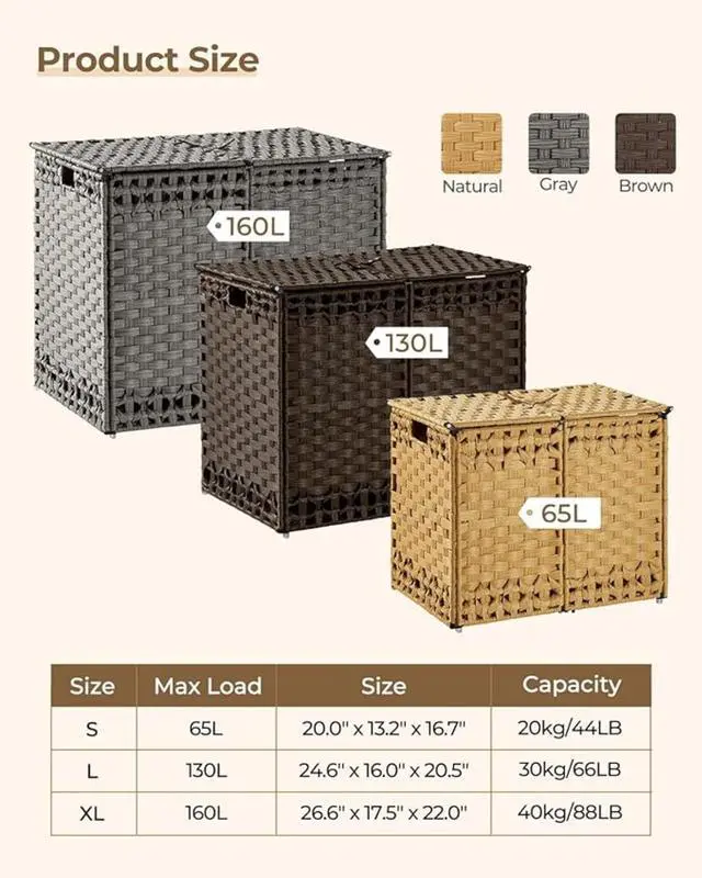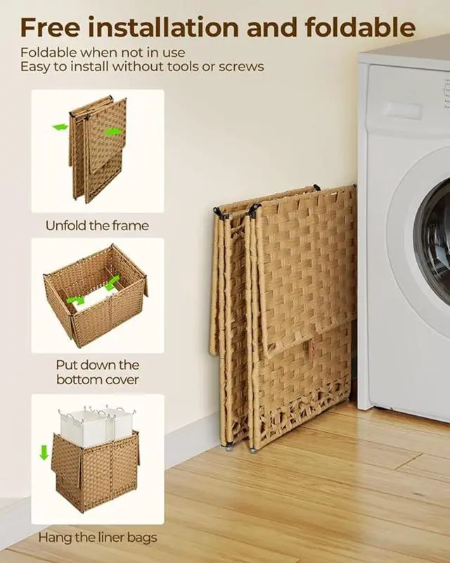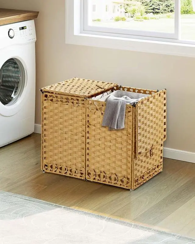 65L woven rattan-style laundry hamper with lid, dual removable bags, bamboo handles, and foldable frame, ideal for sorting and storing laundry in any room. Color: Goose Yellow; Type: Woven laundry hamper with lid; Capacity: 65L (44 lbs); Compartments: 2 removable liner bags (2-section + 1-section); Material: PP rattan, metal frame, bamboo handles; Size: 20.0" L × 13.2" W × 16.7" H; Weight Limit: 20kg; Features: Foldable, tool-free setup, washable liner bags, silica gel feet; Use: Bedroom, bathroom, laundry room, closet.