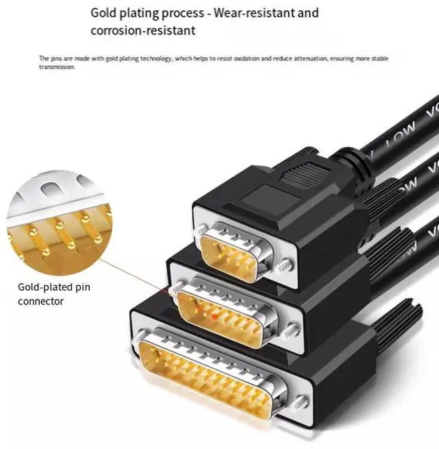 An industrial-grade metal DB9/DB15/DB25 connecting cable is a type of cable that is used to connect devices in industrial environments. It typically has a male connector on one end and a female connector on the other end and is made of metal to provide durability and resistance to damage. The connectors may be gold-plated to provide a high-quality connection and reduce signal loss.