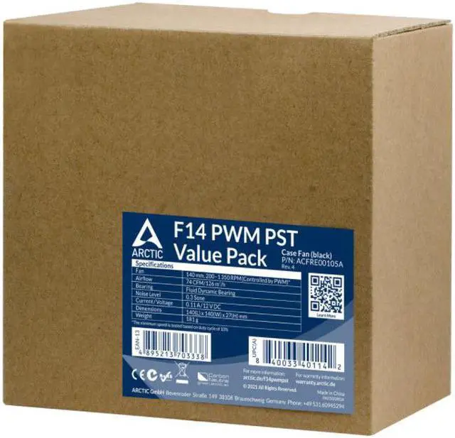 Long Service Life The Arctic F14 PWM PST features a Fluid Dynamic Bearing that is complete with an oil capsule to prevent leakage, bringing you the quiet performance of a sleeve bearing but with a much longer service life. Perfect Fan Regulation with PWM PWM Technology allows compatible motherboards to precisely control fans to only run at the speeds necessary to meet demand. Bringing quiet yet efficient cooling performance. Made in Germany The Arctic F14 PWM PST fan is well known for its high airflow at comfortable noise levels, further improvements have been made to the motor and controller, German engineers created the F14 PWM PST fan work at lower speed when performance is not needed.