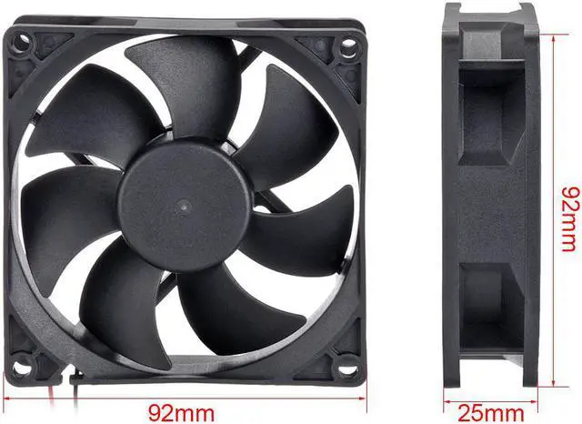 • 92mm DC Brushless Fan, comes with 2 bare wire.Dimension: 92*92*25mm (3.62*3.62*0.98 inches); Lead Wire Length: 250mm (red+, black-).Input (Watt): 7.2W; Speed (R.P.M.): 4100 R.P.M. (+ / - 10%).