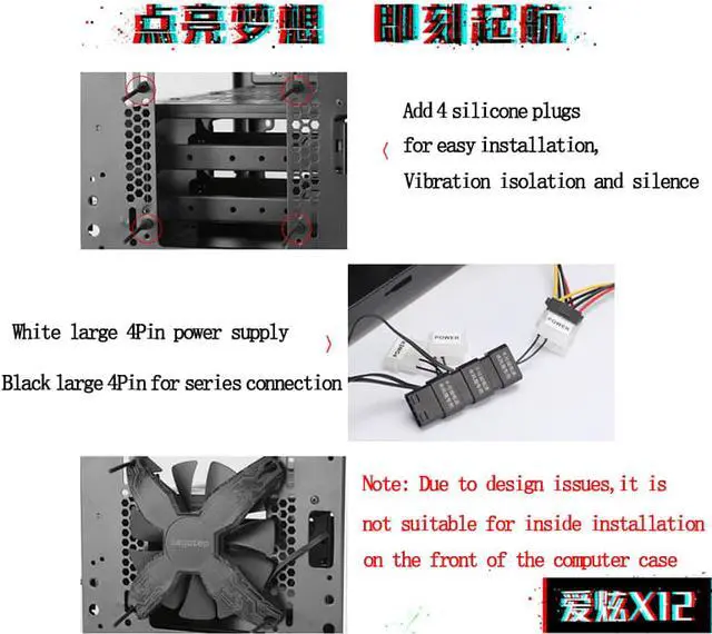Add 4 silicone plugs for easy installation, vibration isolation and silence White large 4Pin power supply, Black large 4Pin for series connection