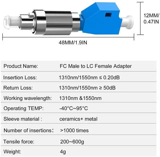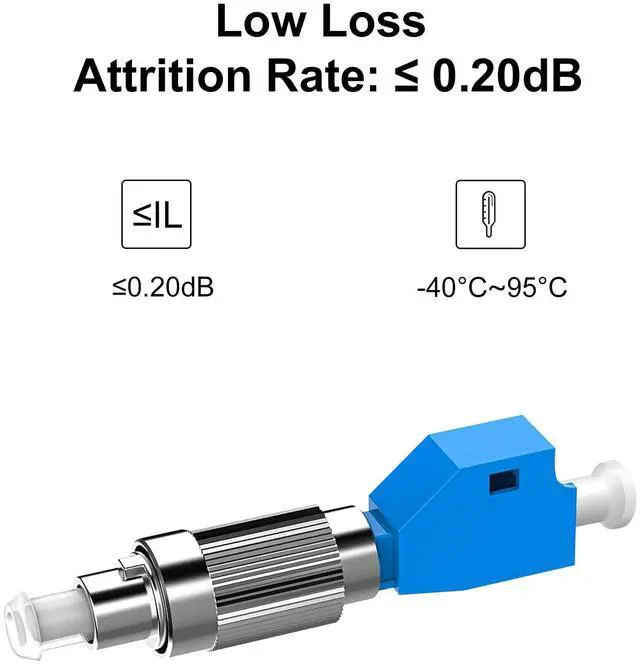 [Low Loss] To reduce signal loss, FC UPC Male to LC UPC Female Adapter is insensitive to light waves and can meet the transmission requirements of wavelengths 1310nm& 1550nm. Compact and lightweight, the number of plug insertion frequency with over 1000 times, and has good flame retardancy, high temperature resistance, high impact strength and beautiful appearance.