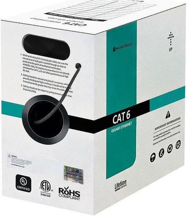 Features: Unshielded Twisted Pair (UTP) Category 6 Ethernet cable. 23AWG solid, pure bare copper conductors. CMP (Plenum) fire safety rating. 550MHz bandwidth. 1000 foot roll. TAA compliant. Monoprice Ethernet cables are made of 100% pure bare copper wire, as opposed to copper clad aluminum (CCA) wire, and are therefore fully compliant with UL Code 444 and National Electrical Code TIA 568 C. 2 fire and safety standards, which require pure bare copper wire in communications cables.