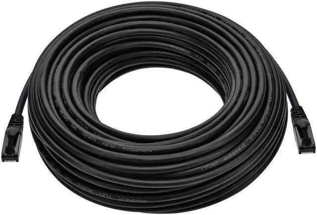 Monoprice Cat6A Flex TPE Ethernet Network Patch Cable is ultra-flexible and made with a PE + PVC compound sheath. It can withstand continuous flexing from motion applications used in the automotive, transportation, or robotics industries. The superior high-frequency characteristics and 10-GB data transmission rates of the Cat6A CM cable passed the DSX-8000 Fluke channel test @ 500 MHz and guarantee excellent performance. The durable wire offers an oil-resistant and UV-resistant jacket with a temperature range of -40 °F to 176 °F and is ideally used for industrial or outdoor environments. Made with 100% black cables and black connectors, the industry-rated 50u gold-plated plug ensures long-term network performance.