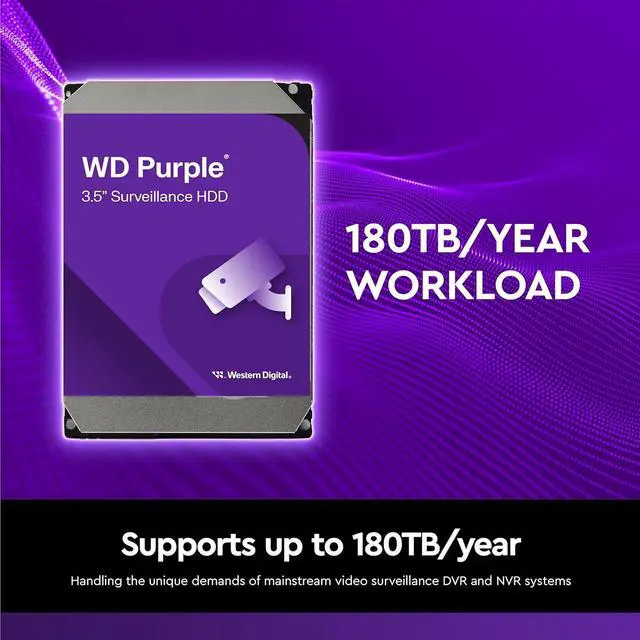 Uncompromising Storage with a WD Purple Surveillance Hard Drive WD Purple drives are engineered specifically for surveillance to help withstand the elevated heat fluctuations and equipment vibrations within NVR environments. An average desktop drive is built to run for only short intervals, not the harsh 24/7 always-on environment of a high-definition surveillance system. With WD Purple, you get reliable, surveillance-class storage thats tested for compatibility in a wide range of security systems, and some of our latest models (WD22PURZ, WD42PURZ, and WD63PURZ) have improved power efficiency. Exclusive AllFrame technology helps reduce frame loss and improve overall video playback. Industry-Leading Storage. Surveillance You Can Trust.Western Digital is a worldwide leader in the hard drive industry. With WD Purple surveillance storage, you have a drive engineered for high temperature, always-on surveillance systems so you can rely on quality video playback when you need it most. Whether youre protecting loved ones or monitoring your business, WD Purple offers performance you can trust. Western Digital's Exclusive AllFrame TechnologyAll WD Purple drives are equipped with AllFrame technology, which improves ATA streaming to help reduce frame loss and improve overall video playback, within a multitude of security video solutions. Enhanced Workload RatingsWD Purple drives feature a workload rating of up to 180TB/year2 - up to three times that of desktop drives - to handle the unique demands of mainstream video surveillance DVR and NVR systems. Multiple Cameras, Multiple StreamsModern recorders now support multiple video streams per camera. WD Purple drives support up to 64 single-stream HD cameras (6TB1 and above), and can also support many of the latest cameras that transmit multiple streams to enable basic AI functionality. With so many options, you have the flexibility to upgrade or expand your security applications in the future. Designed for Today's and Tomorrow's Surveillance SolutionsWith an MTBF of up to 1 million hours3, WD Purple drives are engineered for mainstream surveillance DVRs and NVRs that operate 24/7. With tarnish-resistant components3 and support for more than eight bays4, WD Purple drives deliver reliable operation even in harsh environments. Wide Compatibility. Seamless Integration.