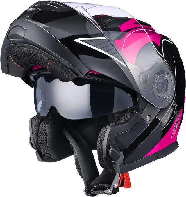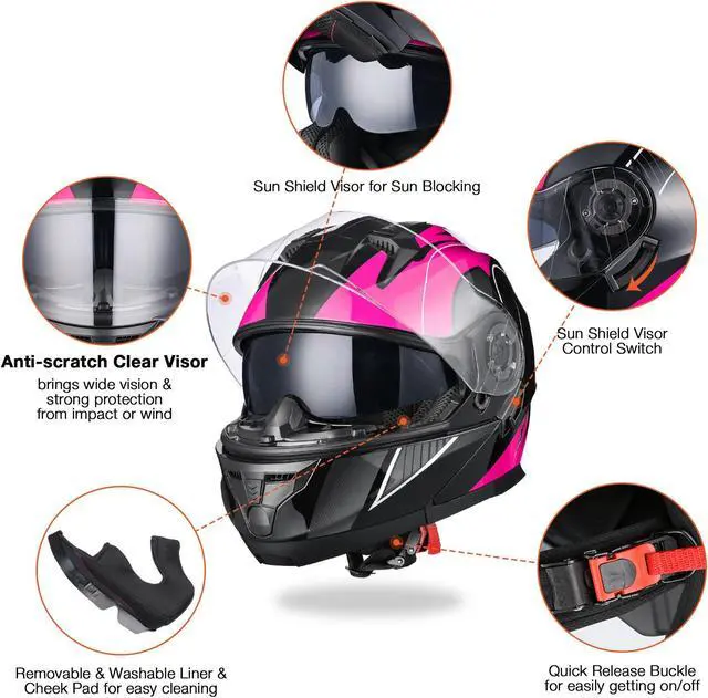- Dual Visor & Quick Release Buckle - Transparent visor brings clear & wide vision and strong protection from impact or wind; Sun shield visor for sun blocking; Quick release buckle on adjustable chin strap to easily taking on/off for your convenience