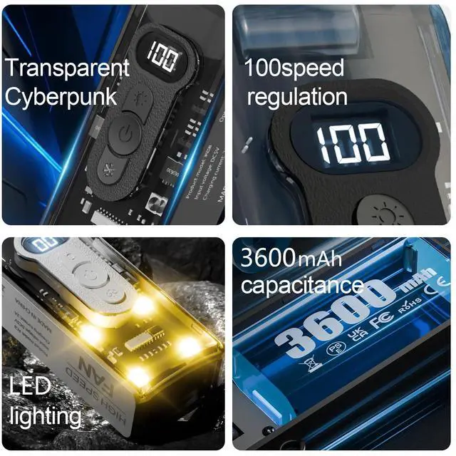 USB Rechargeable Cold Fan Large Capacity 3600mAh Battery, 100-level Stepless Air Volume Adjustment, Folding & Led Lighting, Cyberpunk Style, Use Outdoors and Indoors