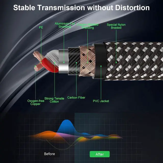 Multi-Layers Of ShieldingThis XLR Cable Combined Oxygen-free Copper conductor with multi shielding(cotton, copper, carbon fiber, TPE jacket, Nylon braided), can be effective in shielding 99% of the clutter and static interference signals, eliminating noise, attaining the maximum cancellation of hum and ensuring high fidelity sound quality.