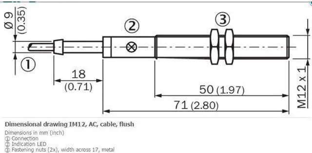 Features Housing Cylindrical thread design Housing Standard Thread size M12 x 1 Diameter Ø 12 mm Sensing range Sn 2 mm Safe sensing range Sa 1.62 mm Installation type Flush Switching frequency 25 Hz Connection type Cable, 2-wire, 2 m Output function NC Electrical wiring AC 2-wire Enclosure rating IP67 1) MECHANICS/ELECTRONICS Mechanics/electronics Supply voltage 20 V AC... 250 V AC Voltage drop = 8.5 V 1) Time delay before availability = 10 ms Hysteresis 1 %... 15 % Reproducibility = 10 % 2) 3) Temperature drift (of Sr) ± 10 % EMC According to EN 60947-5-2 As per EN 55011, class B Continuous current Ia = 250 mA 4) = 200 mA 5) Off-state current = 3 mA (AC 250 V) = 1.5 mA (AC 120 V) Minimum load current = 8 mA Short-time withstand current 0.9 A 6) Cable material PUR/PVC Conductor size 0.5 mm² Short-circuit protection – 7) Power-up pulse protection? Shock and vibration resistance 30 g, 11 ms / 10.