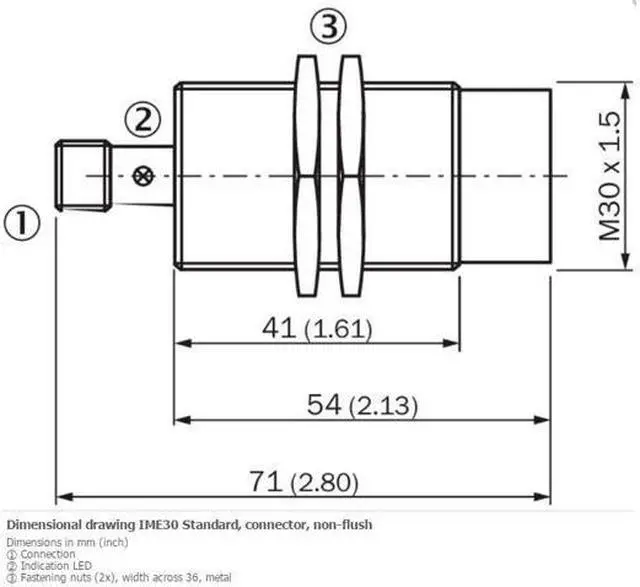 FEATURES Housing Cylindrical thread design Housing Standard Thread size M30 x 1.5 Diameter Ø 30 mm Sensing range Sn 20 mm Safe sensing range Sa 16.2 mm Installation type Non-flush Switching frequency 500 Hz Connection type Male connector M12, 4-pin Switching output PNP Output function NC Electrical wiring DC 3-wire Enclosure rating IP67 1) MECHANICS/ELECTRONICS Supply voltage 10 V DC... 30 V DC Ripple = 10 % Voltage drop = 2 V 1) Current consumption 10 mA 2) Time delay before availability = 125 ms Hysteresis 5 %... 15 % Reproducibility = 2 % 3) 4) Temperature drift (of Sr) ± 10 % EMC According to EN 60947-5-2 Continuous current Ia = 200 mA Short-circuit protection? Reverse polarity protection? Power-up pulse protection? Shock and vibration resistance 30 g, 11 ms/10 Hz.