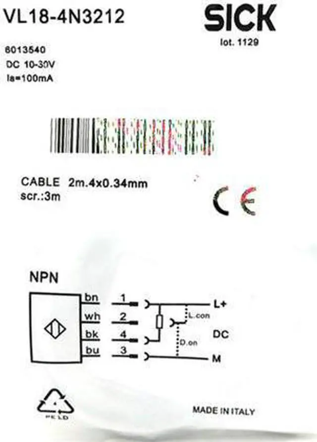 SICK VL18-4N3212 Photoelectric Retro-Reflective Sensor, NPN, New FEATURES Sensor/ detection principle Photoelectric retro-reflective sensor Housing design (light emission) Cylindrical Housing length 63.6 mm Thread diameter (housing) M18 x 1 Optical axis Axial Sensing range max. 0.05 m... 3.7 m 1) Sensing range 0.05 m... 3 m 1) Type of light Visible red light Light source LED 2) Light spot size (distance) Ø 150 mm (3 m) Angle of dispersion Approx. 2.8 ° Adjustment Potentiometer, 270° (Sensitivity) MECHANICS/ELECTRONICS Supply voltage 10 V DC... 30 V DC 1) Ripple = 10 % 2) Power consumption 30 mA 3) Switching output NPN 4) Switching mode Light/dark switching 4) Switching mode selector Selectable via L/D control cable Output current Imax.