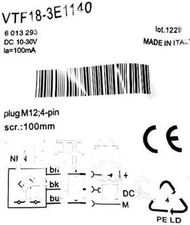 100 mA Response time = 2 ms 4) Switching frequency 250 Hz 5) Connection type Male connector M12, 4-pin Circuit protection A 6) B 7) C 8) D 9) Protection class III Weight 120 g Housing material Metal, Nickel-plated brass Optics material Plastic, PMMA Enclosure rating IP67 Special feature Focused optics Ambient operating temperature –25 °C... +70 °C UL File No. NMFT2. E175606