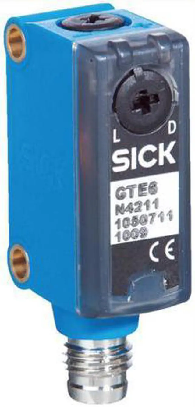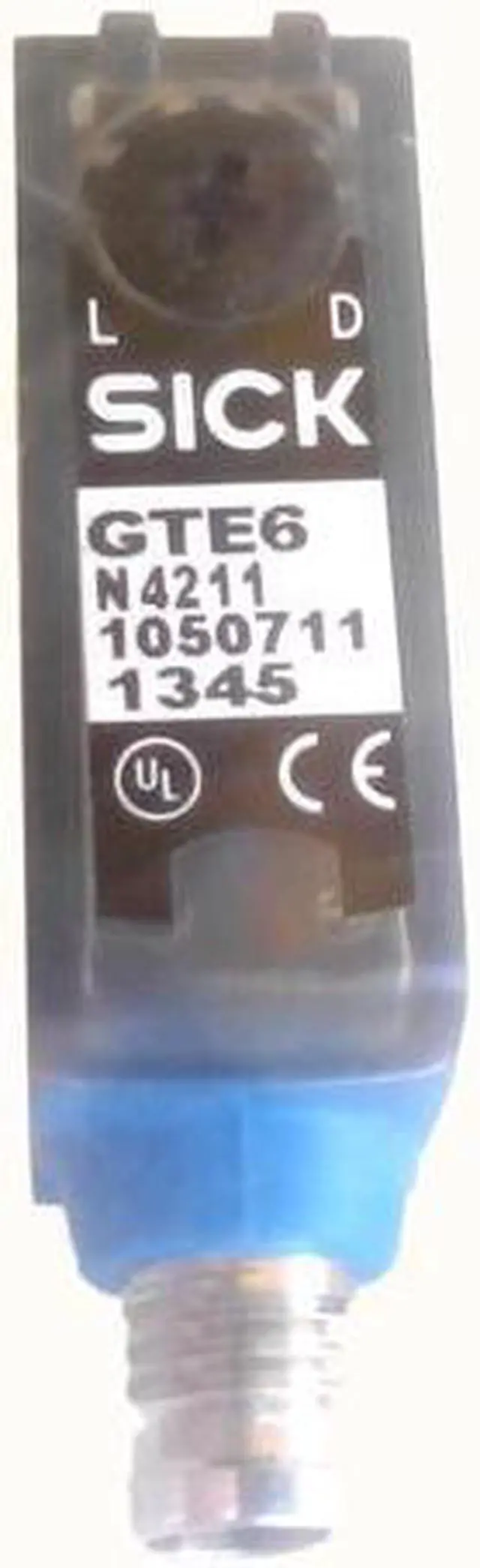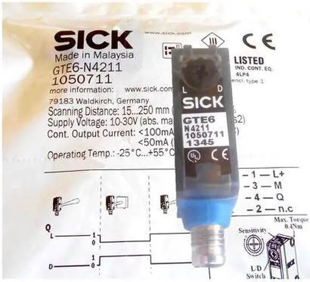 SICK GTE6-N4211 Miniature Photoelectric Sensors, NPN, New FEATURES Sensor/ detection principle Photoelectric proximity sensor, energetic Dimensions (W x H x D) 12 mm x 31.5 mm x 21 mm Housing design (light emission) Rectangular Sensing range max. = 300 mm 1) Sensing range = 250 mm Type of light Visible red light Light source PinPoint LED 2) Light spot size (distance) Ø 7 mm (90 mm) Wave length 650 nm Adjustment Mechanical spindle, 5 turns MECHANICS/ELECTRONICS Supply voltage 10 V DC... 30 V DC 1) Ripple ± 10 % 2) Power consumption 30 mA 3) Switching output NPN Switching mode Light/dark switching Switching mode selector Selectable via light/dark selector Signal voltage NPN HIGH/LOW Approx.