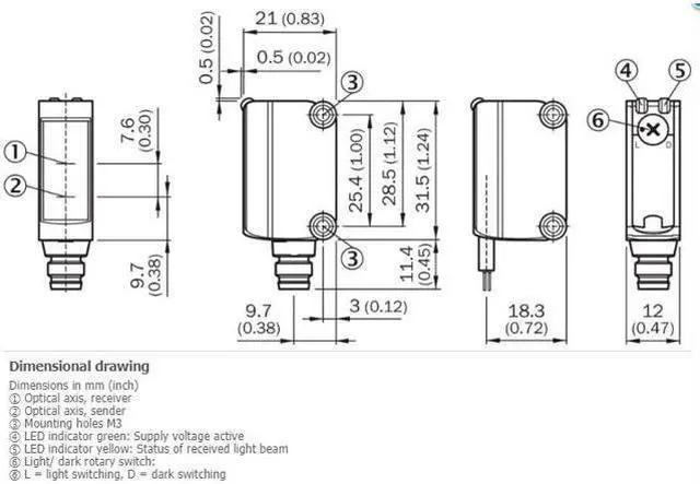 VS / = 3 V Output current Imax. = 100 mA 4) Response time < 1, 250 ms 5) Switching frequency 500 Hz 6) Connection type Male connector M8, 4-pin Circuit protection A 7) B 8) D 9) Protection class III Weight 20 g Housing material Plastic, ABS/PC Optics material Plastic, PMMA Enclosure rating IP67 Ambient operating temperature –25 °C... +55 °C 10) Ambient storage temperature –40 °C... +70 °C