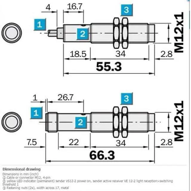 = 100 mA 3) Response time = 2 ms 4) Switching frequency 250 Hz 5) Connection type Male connector M12, 4-pin Circuit protection A 6) B 7) C 8) D 9) Protection class III Weight 36 g Housing material Metal, Nickel-plated brass/PA Optics material Plastic, PMMA Enclosure rating IP67 Ambient operating temperature –25 °C... +70 °C Ambient storage temperature –25 °C... +70 °C
