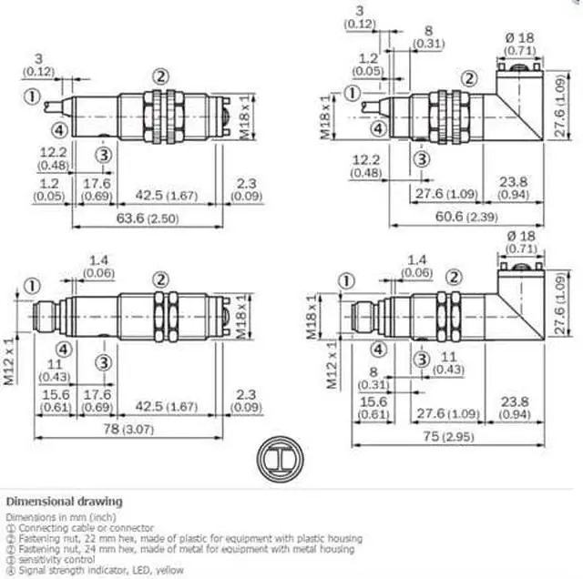 100 mA Response time = 2 ms 4) Switching frequency 250 Hz 5) Connection type Male connector M12, 4-pin Circuit protection A 6) B 7) C 8) D 9) Protection class III Weight 120 g Polarisation filter? Housing material Metal, Nickel-plated brass Optics material Plastic, PMMA Enclosure rating IP67 Ambient operating temperature –25 °C... +70 °C UL File No. NMFT2. E175606