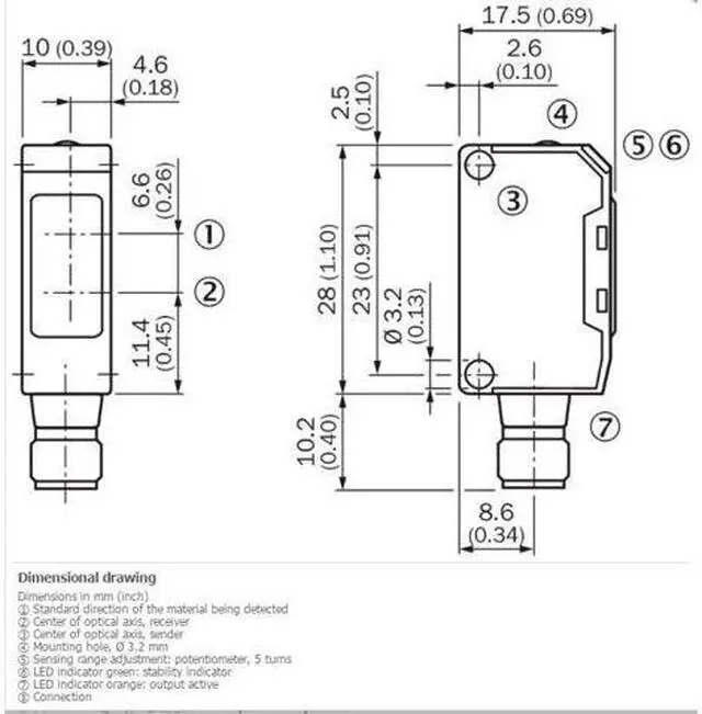 FEATURES Sensor/ detection principle Photoelectric proximity sensor, energetic Dimensions (W x H x D) 10 mm x 28 mm x 17.5 mm Housing design (light emission) Rectangular Sensing range max. 10 mm... 250 mm 1) Sensing range 10 mm... 200 mm Type of light Visible red light Light source LED 2) Angle of dispersion Approx. 6° Adjustment Potentiometer, 270° MECHANICS/ELECTRONICS Supply voltage 10 V DC... 30 V DC 1) Ripple ± 10 % 2) Power consumption 20 mA 3) Switching output PNP Switching mode Light/dark switching Switching mode selector Selectable via L/D control cable Output current Imax.