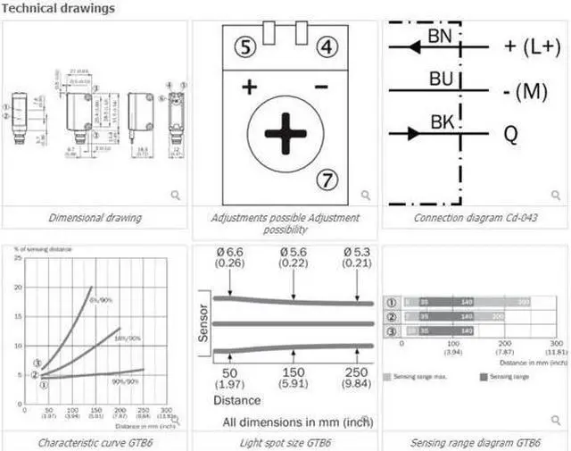 SICK GTB6-P1211 Miniature Photoelectric Sensors New Features Sensor/ detection principle Photoelectric proximity sensor, Background suppression Dimensions (W x H x D) 12 mm x 31.5 mm x 21 mm Housing design (light emission) Rectangular Sensing range max. 5 mm... 250 mm 1) Sensing range 35 mm... 140 mm Type of light Visible red light Light source PinPoint LED 2) Light spot size (distance) Ø 6 mm (100 mm) Wave length 650 nm Adjustment Mechanical spindle, 5 turns Mechanics/electronics Supply voltage 10 V DC... 30 V DC 1) Ripple ± 10 % 2) Power consumption 30 mA 3) Switching output PNP Switching mode Light/dark switching Switching mode selector Selectable via light/dark selector Signal voltage PNP HIGH/LOW VS - (= 3 V) / approx.