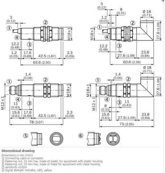 100 mA Response time = 2 ms 4) Switching frequency 250 Hz 5) Connection type Male connector M12, 4-pin Circuit protection A 6) B 7) C 8) D 9) Protection class III Weight 100 g Housing material Plastic, PBT/PC Optics material Plastic, PMMA Enclosure rating IP67 Ambient operating temperature –25 °C... +70 °C UL File No. NMFT2. E175606