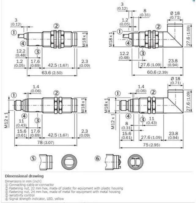 100 mA Response time = 2 ms 4) Switching frequency 250 Hz 5) Connection type Male connector M12, 4-pin Circuit protection A 6) B 7) C 8) D 9) Protection class III Weight 100 g Housing material Plastic, PBT/PC Optics material Plastic, PMMA Enclosure rating IP67 Ambient operating temperature –25 °C... +70 °C UL File No. NMFT2. E175606