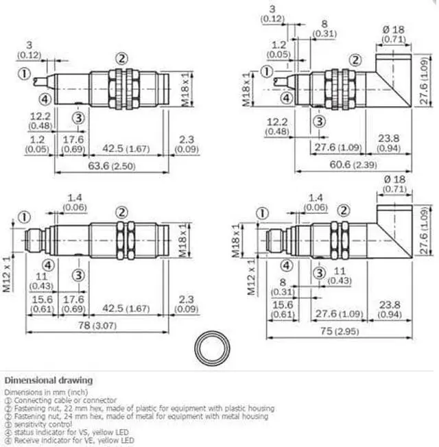 100 mA Response time = 2 ms 4) Switching frequency 250 Hz 5) Connection type Male connector M12, 4-pin Circuit protection A 6) B 7) C 8) D 9) Protection class III Weight 240 g Housing material Metal, Nickel-plated brass Enclosure rating IP67 Test input sender off TE to 0 V Ambient operating temperature –25 °C... +70 °C UL File No. NMFT2. E175606