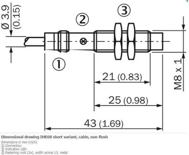 FEATURES Housing Cylindrical thread design Housing Short-body Thread size M8 x 1 Diameter Ø 8 mm Sensing range Sn 4 mm Safe sensing range Sa 3.24 mm Installation type Non-flush Switching frequency 4, 000 Hz Connection type Cable, 3-wire, 2 m Switching output NPN Output function NC Electrical wiring DC 3-wire Enclosure rating IP67 1) MECHANICS/ELECTRONICS Supply voltage 10 V DC... 30 V DC Ripple = 10 % Voltage drop = 2 V 1) Current consumption 10 mA 2) Time delay before availability = 100 ms Hysteresis 5 %... 15 % Reproducibility = 2 % 3) 4) Temperature drift (of Sr) ± 10 % EMC According to EN 60947-5-2 Continuous current Ia = 200 mA Cable material PVC Conductor size 0.25 mm² Cable diameter Ø 3.9 mm Short-circuit protection? Reverse polarity protection? Power-up pulse protection? Shock and vibration resistance 30 g, 11 ms/10 Hz.