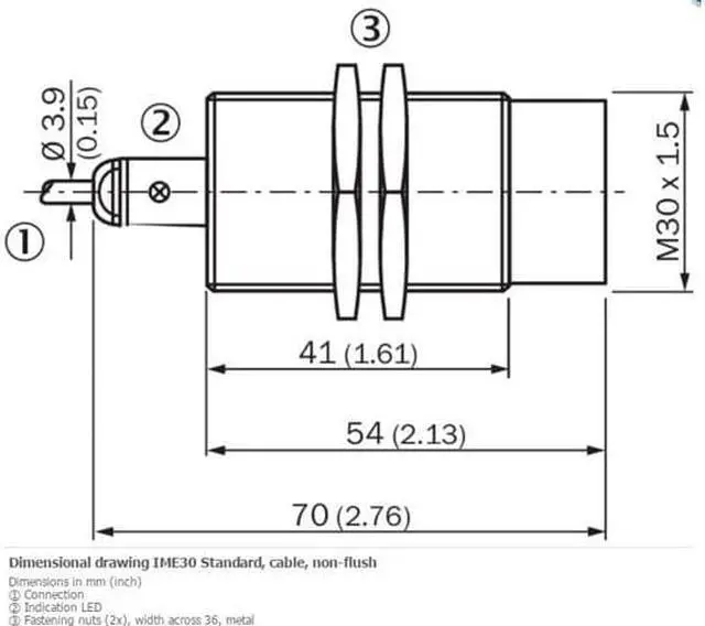 FEATURES Housing Cylindrical thread design Housing Standard Thread size M30 x 1.5 Diameter Ø 30 mm Sensing range Sn 20 mm Safe sensing range Sa 16.2 mm Installation type Non-flush Switching frequency 500 Hz Connection type Cable, 3-wire, 2 m Switching output PNP Output function NC Electrical wiring DC 3-wire Enclosure rating IP67 1) MECHANICS/ELECTRONICS Supply voltage 10 V DC... 30 V DC Ripple = 10 % Voltage drop = 2 V 1) Current consumption 10 mA 2) Time delay before availability = 125 ms Hysteresis 5 %... 15 % Reproducibility = 2 % 3) 4) Temperature drift (of Sr) ± 10 % EMC According to EN 60947-5-2 Continuous current Ia = 200 mA Cable material PVC Conductor size 0.25 mm² Cable diameter Ø 3.9 mm Short-circuit protection? Reverse polarity protection? Power-up pulse protection? Shock and vibration resistance 30 g, 11 ms/10 Hz.