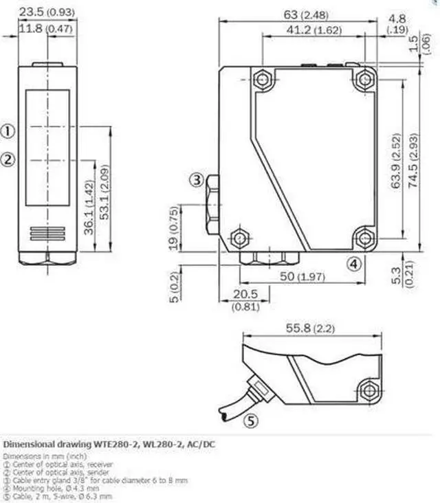 FEATURES Sensor/ detection principle Photoelectric retro-reflective sensor, Dual lens Dimensions (W x H x D) 23.5 mm x 74.5 mm x 63 mm Housing design (light emission) Rectangular Sensing range max. 0.01 m... 15 m 1) Sensing range 0.01 m... 13 m 1) 0.01 m... 11 m 2) Type of light Visible red light Light source LED 3) Light spot size (distance) Ø 260 mm (8 m) Adjustment Potentiometer MECHANICS/ELECTRONICS Supply voltage 24 V DC... 240 V DC 1) 24 V AC... 240 V AC 1) Power consumption = 5 VA Switching output Relay, electrically isolated 2) Output function Change-over contacts Switching mode Light switching 2) Switching current (switching voltage) 3 A (240 V AC) 3 A (30 V DC) Response time = 15 ms Switching frequency 33 Hz 3) Connection type Cable gland Circuit protection A 4) C 5) Protection class II 6) Overvoltage category 3 Weight + 150 g Polarisation filter? Interference emission EN 61000-6-3 (only –2Hxxxx) 7) Housing material Plastic, ABS Optics material Plastic, PMMA Enclosure rating IP66 IP67 Items supplied Mounting bracket BEF-W280, Reflector P250 Usage category AC-15, DC-13, according to EN 60947-1 EMC EN 60947-5-2 8) Ambient operating temperature –25 °C.