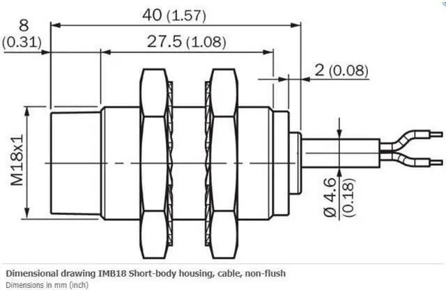 SICK IMB18-12NPSVU2K Inductive Proximity Sensors, PNP, New Features Housing Cylindrical thread design Housing Short-body Thread size M18 x 1 Diameter Ø 18 mm Sensing range Sn 12 mm Safe sensing range Sa 9.72 mm Installation type Non-flush Switching frequency 1, 000 Hz Connection type Cable, 3-wire, 2 m Switching output PNP Output function NO Electrical wiring DC 3-wire Enclosure rating IP68 1) IP69K 2) Mechanics/electronics Supply voltage 10 V DC... 30 V DC Ripple = 10 % Voltage drop = 2 V 1) Current consumption 10 mA 2) Hysteresis 3 %.