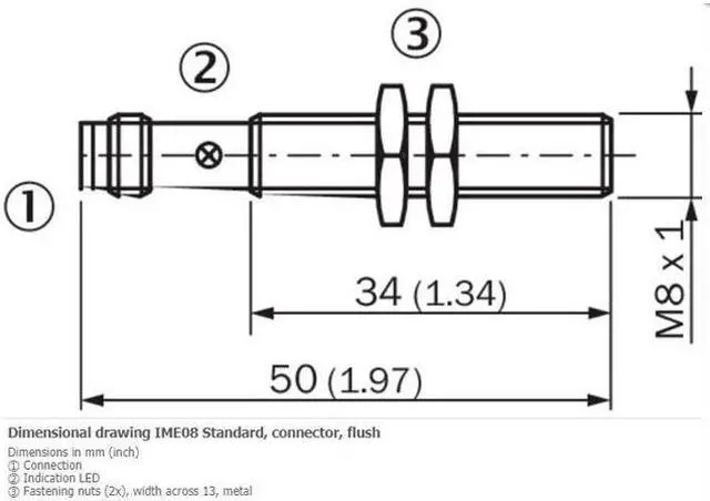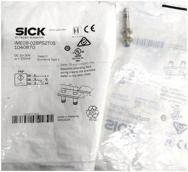 SICK IME08-02BPSZTOS Inductive Proximity Sensors, PNP, New FEATURES Housing Cylindrical thread design Housing Standard Thread size M8 x 1 Diameter Ø 8 mm Sensing range Sn 2 mm Safe sensing range Sa 1.62 mm Installation type Flush Switching frequency 4, 000 Hz Connection type Connector M8, 3-pin Switching output PNP Output function NO Electrical wiring DC 3-wire Enclosure rating IP67 1) MECHANICS/ELECTRONICS Supply voltage 10 V DC... 30 V DC Ripple = 10 % Voltage drop = 2 V 1) Current consumption 10 mA 2) Time delay before availability = 100 ms Hysteresis 5 %.