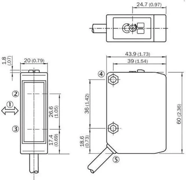 FEATURES Sensor/ detection principle Photoelectric proximity sensor, Background suppression Dimensions (W x H x D) 20 mm x 60 mm x 43.9 mm Housing design (light emission) Rectangular Sensing range max. 150 mm... 500 mm 1) Sensing range 150 mm... 500 mm 1) Type of light Visible red light Light source LED 2) Light spot size (distance) Ø 30 mm (500 mm) Angle of dispersion Approx. 3° Adjustment Potentiometer, 2 turns 3) Potentiometer, 2 rotations MECHANICS/ELECTRONICS Supply voltage 24 V DC... 240 V DC 1) 24 V AC/DC... 240 V AC/DC 1) Power consumption = 5 VA Switching output Relay, electrically isolated 2) Output function Change-over contacts Switching mode Light switching 2) Switching current (switching voltage) 3 A (240 V AC) 3 A (30 V DC) Response time = 15 ms Switching frequency 33 Hz 3) Connection type Cable, 5-wire, 2 m 4) Cable material PVC Conductor cross-section 0.76 mm² Cable diameter Ø 6.4 mm Circuit protection A 5) C 6) Protection class II 7) Overvoltage category 2 Weight 160 g Housing material Plastic, ABS Optics material Plastic, PMMA Enclosure rating IP67 Items supplied BEF-W250 mounting bracket Usage category AC-15, DC-13, according to EN 60947-1 EMC EN 60947-5-2 8) Ambient operating temperature –25 °C.