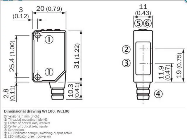 VS / < 1.8 V Output current Imax. = 100 mA Response time = 0.5 ms 4) Switching frequency 1, 000 Hz 5) Connection type Connector M8, 3-pin Circuit protection A 6) B 7) D 8) Weight 9 g Housing material Plastic, ABS/PC/POM Optics material Plastic, PMMA Enclosure rating IP65 Ambient operating temperature –25 °C... +55 °C Ambient storage temperature –40 °C... +70 °C
