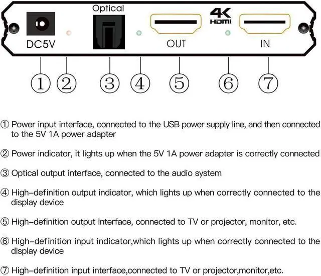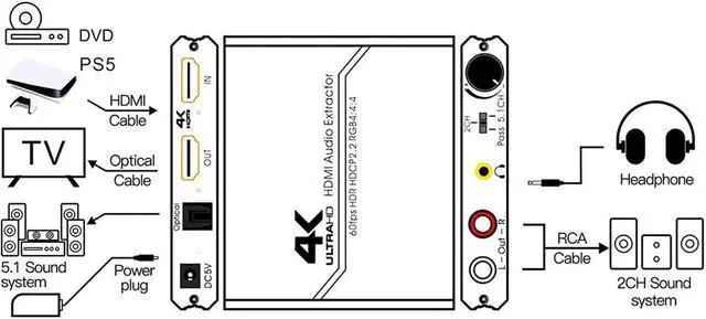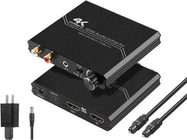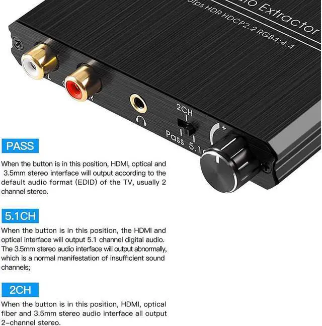 & Volume Control YUV 4:4: 4 HDR 4K@60HZ HDMI Audio Extractor HDMI audio extractor is 1 HDMI input to 1 HDMI ouput + Optical Toslink SPDIF digital audio output(PASS CH/ 5.1CH Mode) and 3.5 headphone jack audio out port, effectively achieves audio synchronization separation to obtain high-quality audio signals.