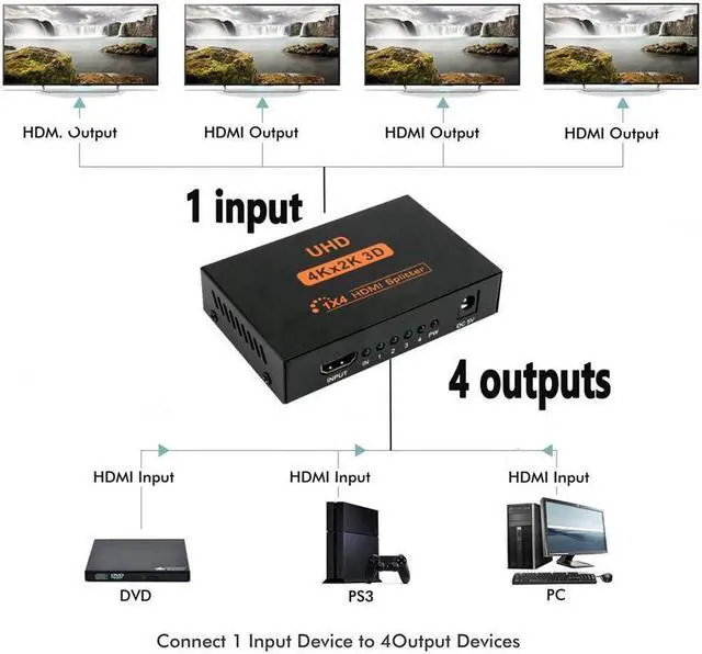 4K HDMI Splitter 1X2 distributes 1 HDMI source to 2 HDMI displays simultaneously with 3D compatibility. It provides HD solutions for HDTV retail and display sites, HDT
