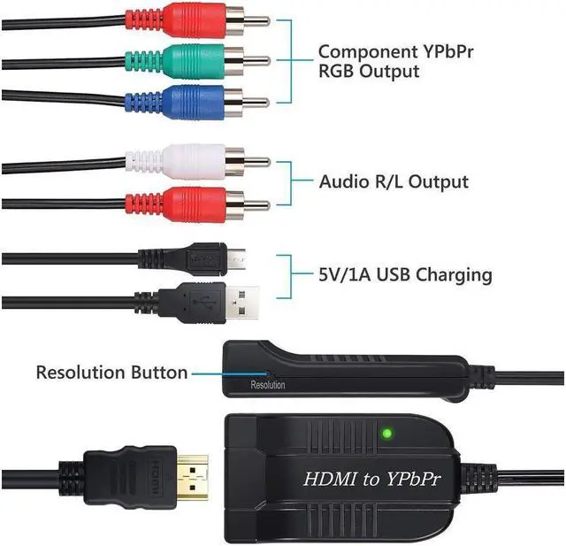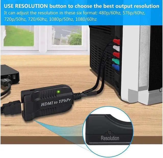 (NOTE: This Converter Only Converts from HDMI to Component YPbPr)Special Design This HDMI YPbPr Converter Combines the HDMI Port with YPbPr R / L Cable While the YPBPR and Audio Cable Heads are Male-designed for Easier Use and No Additional Cable Required. Support Resolution Adjustable & OSD Function Compatible with HDMI 1.3 With 'Resolution' Button You can Adjust the Resolution Format in 6