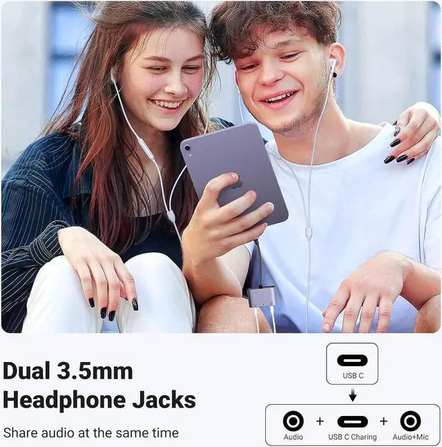 [*Note: Only one 3.5 mm interface supports mic]Hi-Fi Audio with Smart DAC ChipThe built-in DAC chip in USB C to dual 3.5 mm headphone dongle supports up to 24Bit/96KHz. With superb and stable decoding performance it provides Hi-Fi audio with higher fidelity sound for a wonderful music journey. High-quality audio transmission and no current noise will not harm your hearing. This USB C headphone splitter guarantees you share music turn into podcasts or enjoy videos with friends at any timeSuperior PD 60W Fast ChargingThe USB C to 3.5 mm headphone and charge adapter supports 60W PD charging with a built-in powerful charging chip. It satisfies the PD QC and PPS fast charging standards making it appropriate for fast charging of most devices. The charging dongle cable identifies and satisfies the voltage and current required by different devices ensuring stability and security to protect your devices.