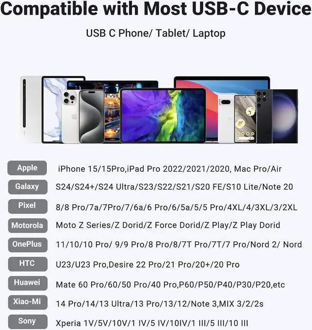 Note: Do not support data transmissionEasy to Use & Ultra Durability The 3 in 1 USB C to 3.5 mm audio adapter is plug-and-play with no driver. With advanced design it is durable for longer service life. Braided nylon cable adds durability and strain relief making plug-and-unplug easier. Premium aluminum alloy case for greater heat dissipation. High-quality connectors ensure secure high-speed data transmission. The portable size is ideal for travel home and officeWide CompatibilityThe USB C to 3.5 mm headphone and charger adapter is compatible with most of the USB-C devices. The USB C port is compatible with iPhone 15 Pro Max/15 Pro/15 Plus/15 Galaxy S24 Ultra/S24+/S24/S23 Ultra/S23+/S23 Pixel 8 Pro/8 Mate 60pro MacBook Pro/Air 2022 iPad Pro/Air 2020-2022 XPS 17/15/13 HP Chromebook x360 Surface Book 3 Tablet S9 Note 20 LG V40 Valve Steam Deck and more.