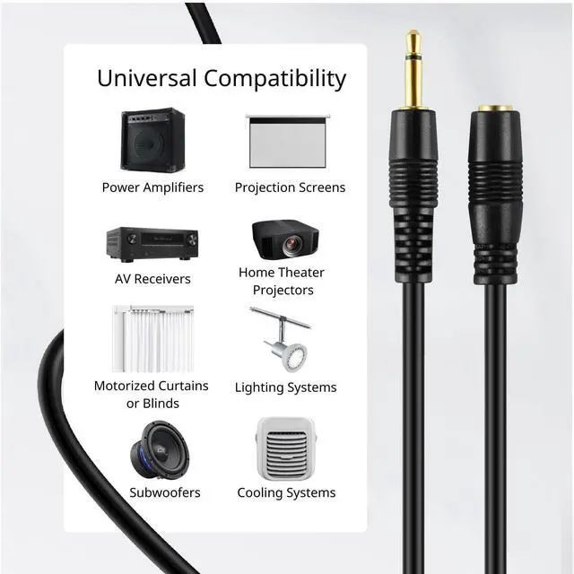 3.5 mm mono extension cable compatible with most A/V components power amps pre-amps projectors electronic screens and IR infrared receivers & sendersDeliver quality signal connectivity; Molded connectors with strain relief ensure a solid high quality connection between the connected devicesHigh performance versatile cable accurately transfer quality detailed clean natural pure audio sound with realism and clarity jitter-free mono format signals; Balanced solid conductors for enhanced internal noise rejection and clearer deeper bass and eliminate strand-interaction distortionOxygen Free Copper Lines combined with a double shielding allow for a maximum audio quality; reduce distortion and signal lossFor use with: DVD Bluray player car audio system DAC CD player game console AV receiver digital recorder headphone computer sound card audiophile quality home theater cinema HiFi system and more
