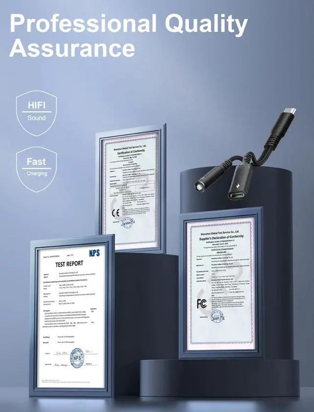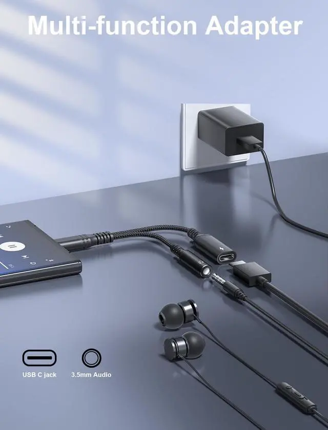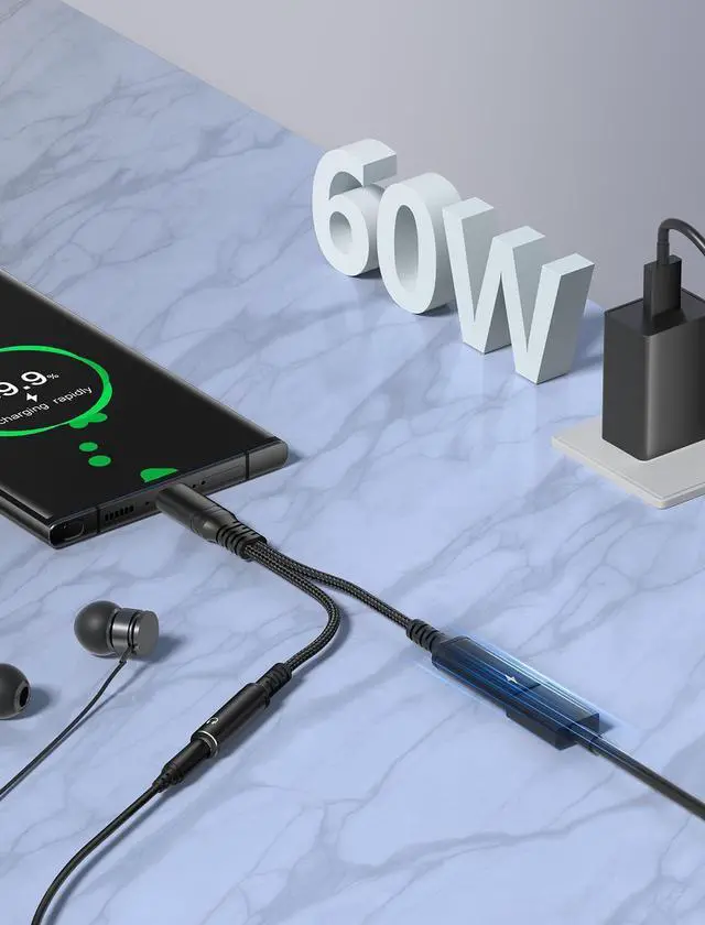 HiFi Audio FidelityThis usb c to 3.5 mm audio adapter and charger features a smart DAC chip with a 48kHz sampling rate and a 92dBFS signal-to-noise ratio ensuring each note is precisely delivered while also maintaining crystal clear noise-free calls immersing you in premium music and call experiences. 60W Fast and Reliable ChargingPhoie usb c to headphone jack adapter offers 60W PD fast charging capabilities. The sophisticated EJ899M chip ensures a stable and efficient charge automatically adjusting voltage and current for your devices while providing comprehensive protection. It is universally compatible with the latest fast charging standards including PD QC AFC and PPS.