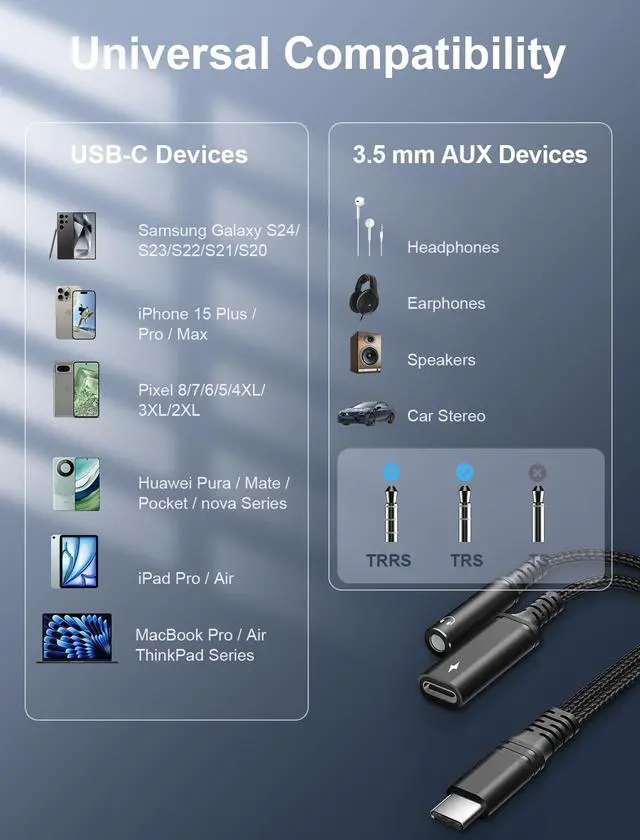 USB-C port: iPhone 15 Pro Plus Max; Galaxy S24 S23 S22 S21 S20 + Plus Ultra FE Z Fold 5 4 3 Z Flip 5 4 3 W24 23 22 20 Note 20 20 Ultra 10+ 10 9 8 Galaxy Tab S8 S7 S6 S5; Google Pixel 7 6 Pro XL; iPad Pro iPad mini 6; MacBook and morePrecautions & ServicesOur compact usb c to jack audio 2 in 1 adapter doesn't support data transfer or headset control. Use PD20W+ wall charger for best charging. We offer a 24-month warranty and 1-hour response support.