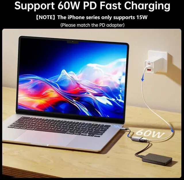 PD 60W Fast ChargingThe USB C Male to USB C Female Adapter support up to 60W PD Charging ,constructed with double-braided exterior and aluminum alloy casing to ensure that it doesn't wear out over time. NOTE: Our usb c adapter support PD fast charging, but Samsung/Iphone is QC fast charging protocol,so maybe can't support Samsung/Iphone fast charging