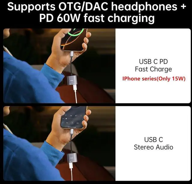 JVFYI USB C to Dual USBC Headphone and Charger Adapter, USB C Splitter 1 in 2 Out Male to Female Audio Dongle Cable with 60W Fast Charging for iPhone 16/15, Samsung Galaxy S25/S24/S23