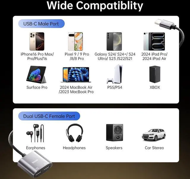 Hi-Fi DAC ChipThis usb c to usb c headphone adapter adopted an advanced DAC Smart Chip supports up to 32bit/96kHz, offer high-definition audio, powerful noise reduction, you can get higher fidelity sound from it.The adapder supports USB-C headphone automatic adaptation,which could be compatible with Analog headphone and digital headphone.And Supports USB 2.0 data transfer