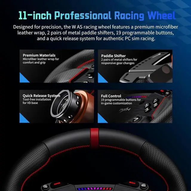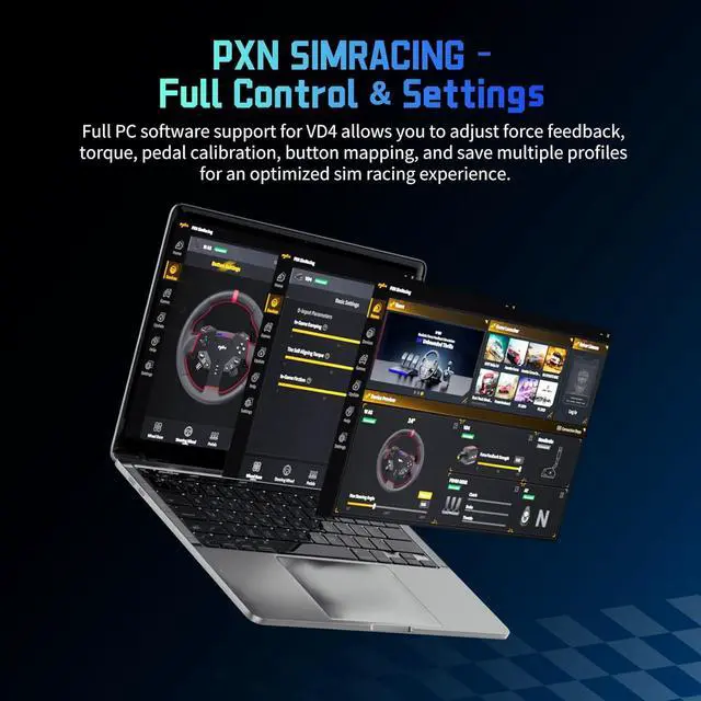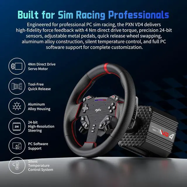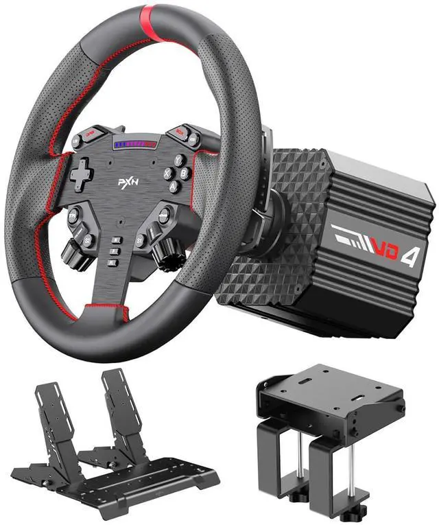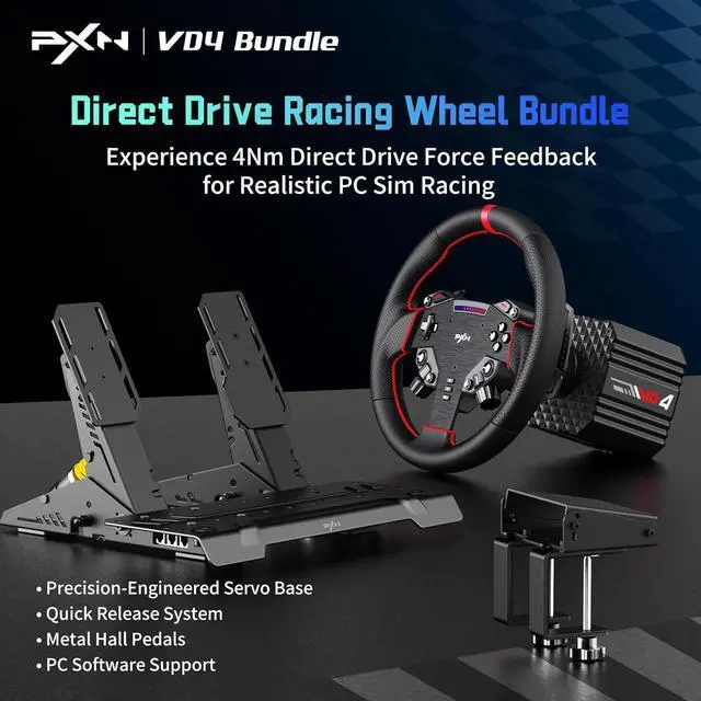 The PXN VD4 Bundle F is an entrylevel directdrive sim racing wheel kit designed for PC racing games. It pairs a 4 Nm directdrive force feedback base with an 11inch steering wheel and a Hall Effect 2pedal set, delivering smooth and precise steering feedback and responsive pedal control. The bundle is compatible with Windows PCs and customizable via PXNs software for a more immersive racing experience.